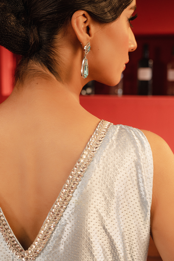 A graceful sky blue long shirt crafted from imported satin silk, featuring a subtle self-pattern of Swarovski beads running throughout the fabric. The sleeveless design is complemented by a front boat neckline and a deep V-neck at the back, lending a touch of sophistication. The neckline & hemline showcases intricate adda work with stone detailing and crystal hanging accents for an added flair. Perfect for formal gatherings, festivals, or evening parties, this elegant piece ensures you stand out effortlessly.