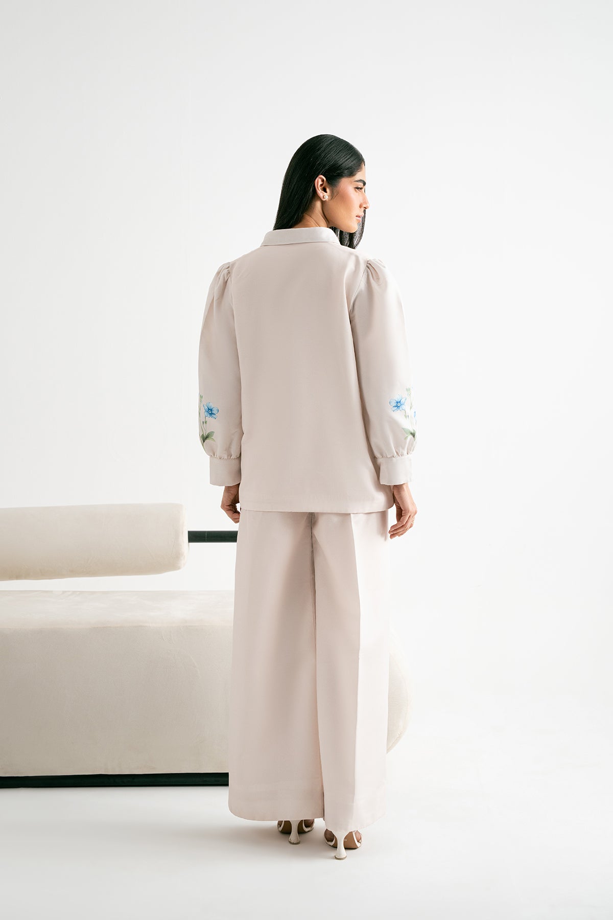 Rendered in soft blush poli lawn, this co-ord set blends elegance with ease. The relaxed-fit shirt features subtle gathers on the sleeves and crisp cuffs, while delicate floral prints in shades of blue add a refreshing touch on both the sleeves and wide-leg trousers. A versatile ensemble that feels both serene and statement-worthy