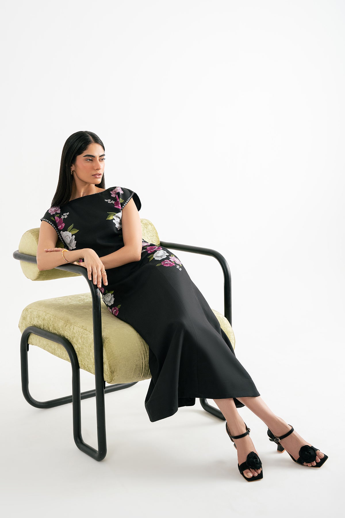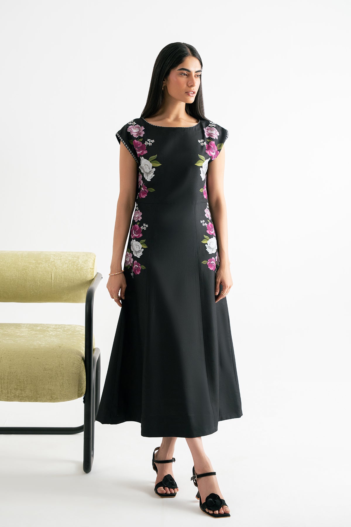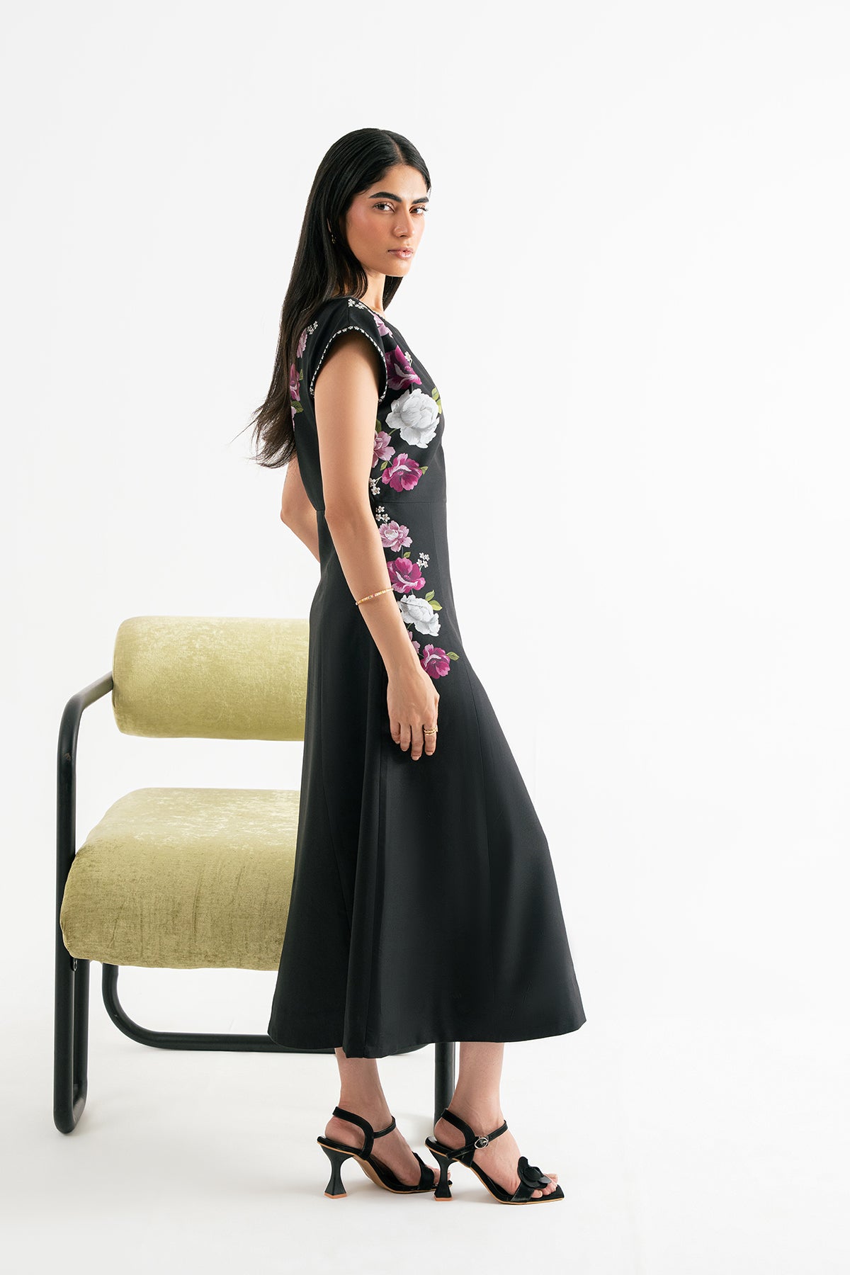 Elegant and timeless, the Midnight Bloom Dress is crafted from breathable poly lawn fabric in a rich black tone. This sleeveless A-line dress features soft floral prints in hues of magenta, white, and green, beautifully placed along the bodice and side panels to flatter your silhouette. Designed with clean lines, a round neckline, and delicate detailing on the sleeves