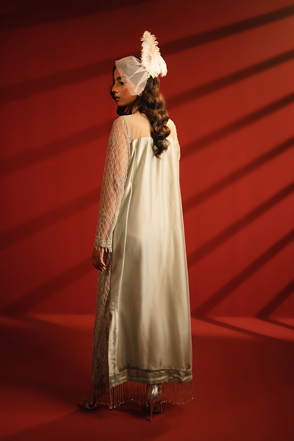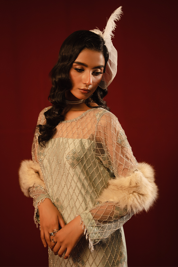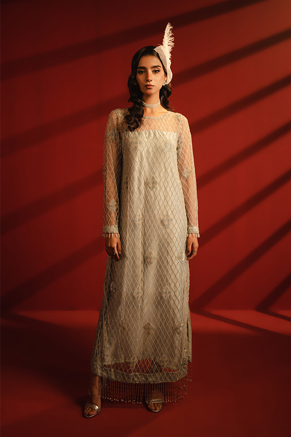 This exquisite sea green ensemble features a long net shirt, carefully hand-embellished with intricate cutdana and sequin work. The shirt is styled with a sophisticated boat neckline, accentuated by full sleeves adorned with elegant crystal hanging details. Its straight-cut inner is crafted from fine silk, providing a graceful and polished look. The border is enhanced with matching crystal embellishments, making it a standout choice for any formal occasion.